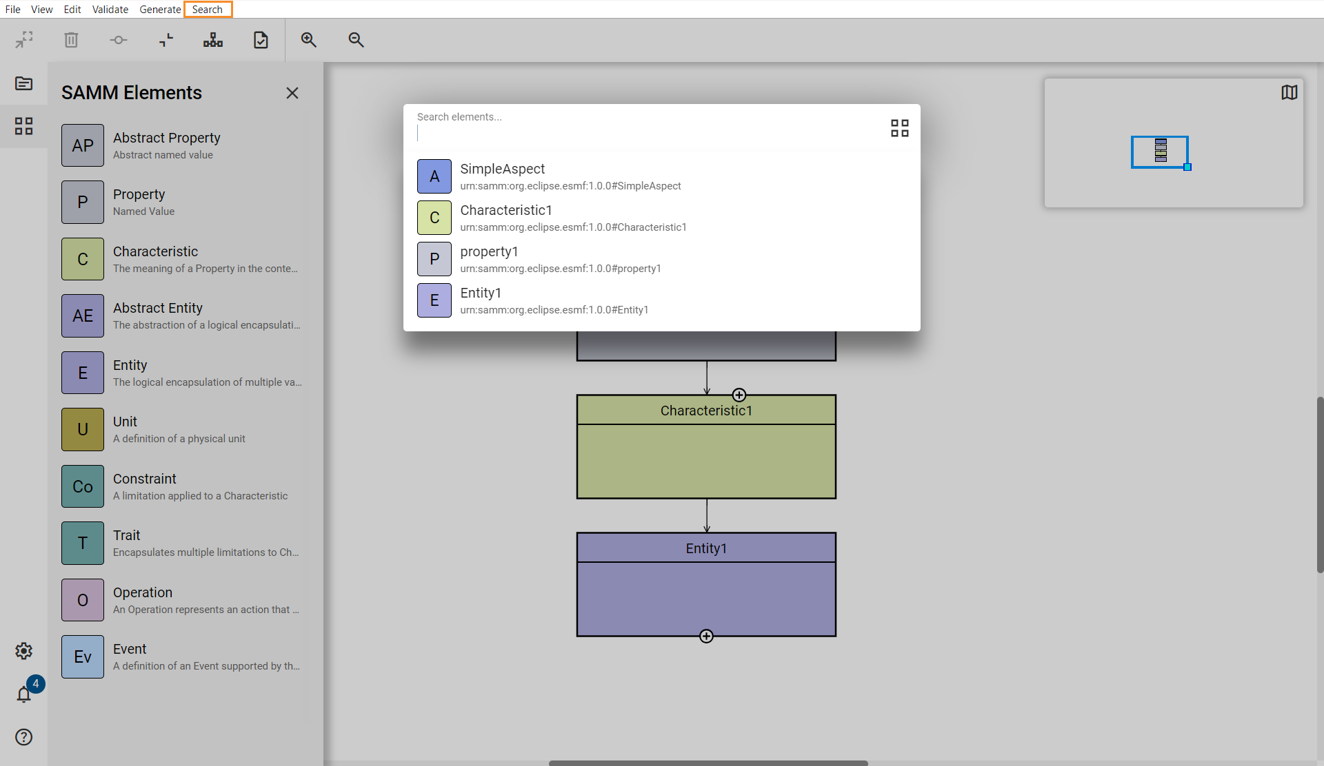 When using the Aspect Model Editor, while creating a new model an Aspect element is created by default. All other elements can then be added. Every element created in the editor can be modified.